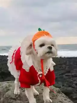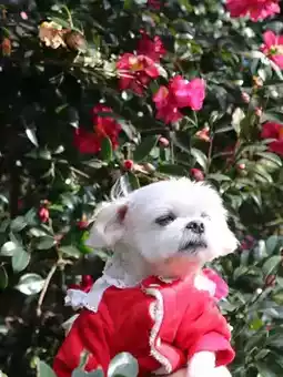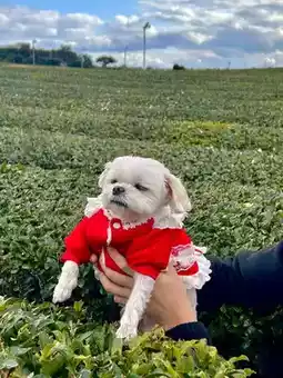 在一片广阔的绿茶园里,我拍到了一只穿着红色连衣裙的狗狗,我还以为他们在拍广告呢ㅎㅎ 它太可爱了,连路人都忍不住驻足观看。