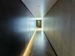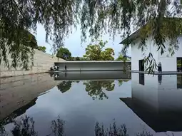 建筑布局包括入口花园、室外花园和水镜花园,并通过连接入口建筑、展览建筑和冥想空间建筑的走廊相连。