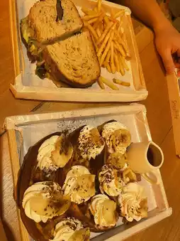 • 香蕉华夫饼:香甜焦糖香蕉片铺在酥脆的华夫饼上,淋上糖浆——甜点爱好者的梦想成真!🍌🧇🍯