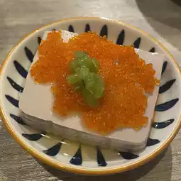 豆腐上铺着蟹黄,散发着淡淡的芥末香气