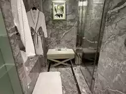 浴室同样令人印象深刻,首先映入眼帘的是专门的吹风和化妆区。酒店还贴心地准备了瑜伽垫和轻型哑铃。浴室里还有一个大型按摩浴缸,里面备有浴盐。淋浴的水压也很棒,带来非常舒适的沐浴体验。