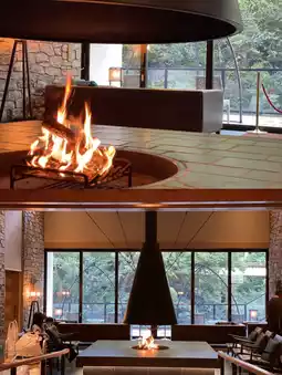 在壁炉休息室享受温暖的炉火环绕,放松身心。俯瞰前台。