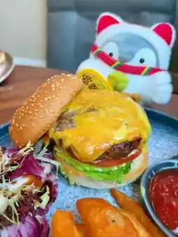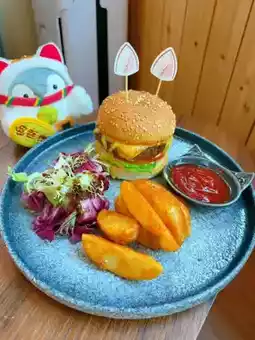 首先点了一份猫咪棕色安格斯牛肉汉堡配薯条😚 套餐里有零食和主食😆 非常丰盛又满足🥰 汉堡造型很独特😎 猫耳朵装饰超可爱❤️ 汉堡是煎的,酥脆可口😋 安格斯牛肉厚实多汁🤩 加上半融化的芝士,味道邪恶又美味😈