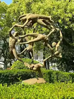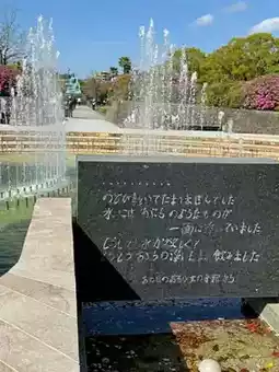公园中心矗立着雕塑家北村清房创作的标志性和平雕像。雕像右指指向天空,警示人们核威胁的危险;左手水平伸展,象征和平。雕像紧闭的双眼,仿佛在为原子弹爆炸的受害者默默祈祷。雕像正前方是和平喷泉,其灵感源于一位小女孩在爆炸后拼命寻找水源的场景。喷泉缅怀所有受害者,强调生命的珍贵。
