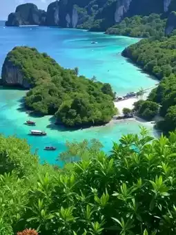 必游景点之一是“玛雅湾”(Maya Bay)🏖️,这里是好莱坞著名电影《海滩》(The Beach)的拍摄地。🎬 玛雅湾拥有细腻的白沙、碧绿的海水和环绕着浪漫海湾的石灰岩山脉,💚