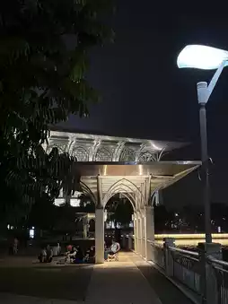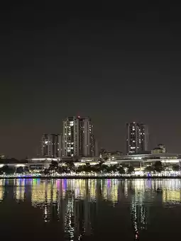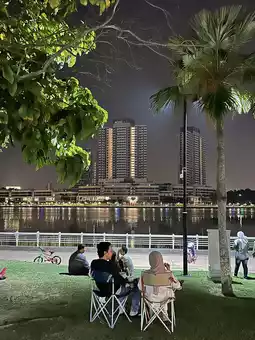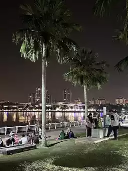 夜幕降临,湖面倒映着城市的灯光,宛如繁星点点。空气清新而宁静。没有车流,没有匆忙——只有潺潺的流水声、远处传来的笑声,以及偶尔从附近餐车传来的“嘿,一杯冰沙!”的叫卖声。🧋😂