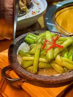 石板焗野菜豆腐:热气腾腾,豆腐皮略带焦香,内里软嫩。切碎的野菜带来清爽的口感,完美解腻。✅