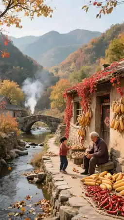 一个被群山环绕的生态示范村,溪流潺潺,石桥横跨。秋季,家家户户都在家门口晾晒玉米和辣椒,红色的藤蔓攀爬在院墙之上,老屋里炊烟袅袅,宛如世外桃源。🏡
