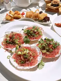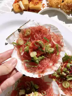外观很特别,主要呈酒红色,除了不常见的用面糊蒸带子的做法外,带子肉质很厚实,吃起来非常新鲜,用酒烹制,面条会吸收所有带子和酒的香气