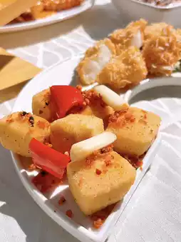 豆腐炸至金黄色,外酥里嫩。避风塘的做法真的很好吃;鱿鱼饼Q弹,切成两半,吃起来很方便