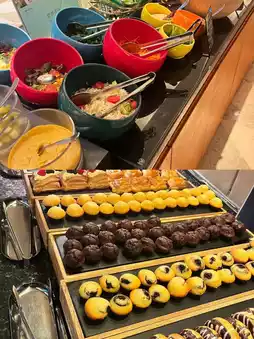 . 餐饮体验:酒廊欢乐时光提供特色蒸点和四种口味的冰淇淋。西式糕点品质不错,且定期更换。中式汤中的牛腩鲜美可口,但主菜炒面味道略显不足,手工春卷口感上乘。临近打烊时,还会补充更多蒸点。楼下的早餐将在下一篇文章中介绍。