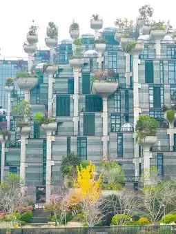 天安千树,这座“千树大厦”坐落于苏州河畔,由Heatherwick Studio设计。其宽阔的柱廊上排列着数千盆盆栽,在苏州河畔营造出一座“绿色山峰”。