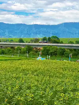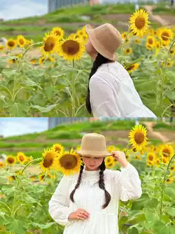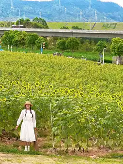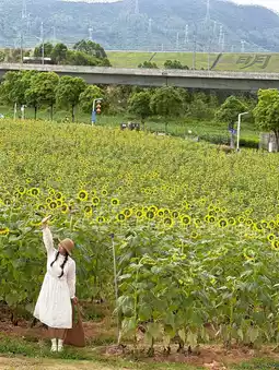 花海中,阳光倾泻而下,每一朵向日葵都像一颗闪耀的小太阳。微风拂过,花海翻腾,空气中弥漫着温暖的花香。拍侧脸和背影照,用花盘遮住脸颊。每一张照片都像日本杂志大片一样美📸 公园里人气爆棚的稻田拍照点其实离西门停车场很近,可以一次性拍到“花海+稻田”的双重美景!