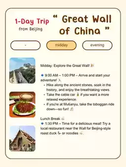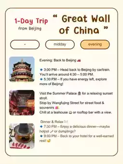 如果您身在北京,想要体验举世闻名的长城,那您一定会度过精彩的一天!准备好欣赏壮丽的景色、呼吸清新的山间空气,以及进行一些小小的运动吧!出发!🎒✨