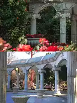 1. 罗马柱廊:日落时分,在花海和罗马柱的映衬下,拍摄剪影或宫廷长裙照片。2