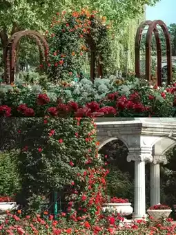 . 玫瑰园:以蓝天为背景,低角度拍摄,突出花朵的繁茂。3