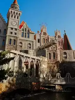 1. 欧式城堡与湖泊倒影:在公园入口处的城堡前,与湖泊和欧式拱桥合影。