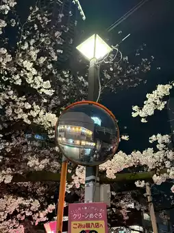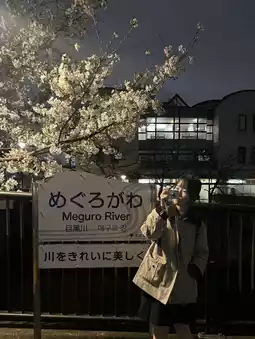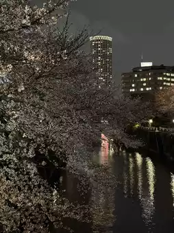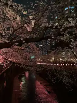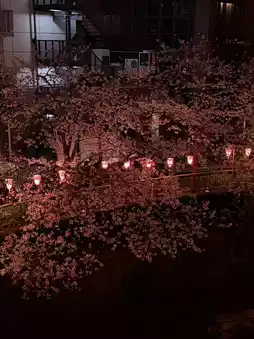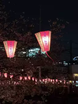 夜晚,樱花在灯光的映衬下熠熠生辉,倒映在河面上,美轮美奂。尤其是在3月下旬至4月上旬举办的“中目黑樱花节”期间,灯笼和美食摊位更增添了节日气氛。 🍷