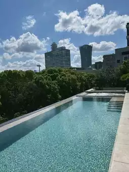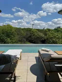 泳池悬于建筑屋顶,玻璃栏杆模糊了空间的界限。代代木公园的树梢与城市天际线在水面上交相辉映。清晨,阳光透过树叶洒落在水面上,在泳池中尽情享受,令人心旷神怡;傍晚,夕阳西下,金红色的光芒将你环绕。任何一张随手拍的照片,都仿佛自带一层天然的森林滤镜。最大的惊喜莫过于泳池旁的“社交酒吧”,在这里,您可以品尝特色鸡尾酒,与旅伴们轻松交谈,发现宾客中不乏设计师、策展人等各界精英。🏨