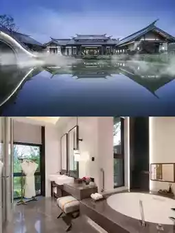 民族风格的宋代建筑,石拱桥、亭台楼阁和水边凉亭点缀着九曲水景,水雾缭绕,宛如仙境。背靠大王峰,面朝滨溪公园,尽享自然美景。