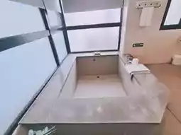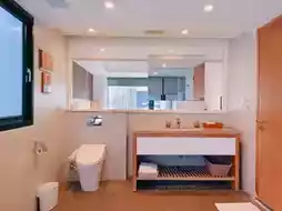 我建议您先用沐浴露清洁一下大浴缸,然后再注水。由于浴缸很大,注满一半大约需要20分钟。等待期间,您可以先淋浴。淋浴区很宽敞,干湿分离的设计非常实用。热水温度充足,而且也有冷水供应。别墅贴心地准备了沐浴露、洗发水、护发素、两条大浴巾和两条小浴巾。