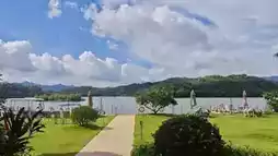 湖泊被群山环抱,湖水清澈见底,宛如一颗翡翠宝石。草坪沿着湖岸绵延,点缀着粉色帐篷和木桌椅,构成一幅令人心旷神怡的画面。沿着石径漫步至湖边,微风带来青草和湖水的清新气息。缓缓驶过的船只在湖面上泛起层层涟漪,仿佛时间都慢了下来。