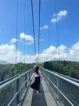 这是日本最高的步行悬索桥,桥面镂空设计。