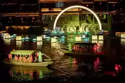 🛶 精彩亮点在此!在【西门码头】搭乘贡多拉,聆听船夫吟唱山东民歌,缓缓穿梭于如诗如画的“小桥流水民居”之间~船桨划过水面,映照着岸边吊脚楼上悬挂的红灯笼,汉服爱好者们在岸边挥手致意。坐在船头,拍一张侧脸照——随风飘扬的秀发更添几分浪漫情调!📸→💦(经过“复兴楼”时抬头看看——它那翘起的屋檐超级上镜)