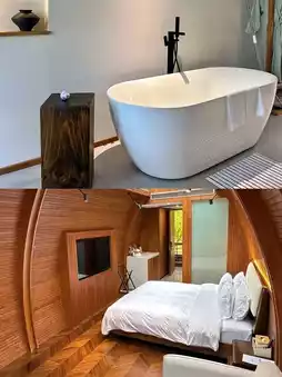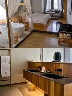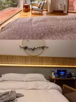 ⏩房间也相当宽敞,还配备了超棒的投影仪!您可以尽情享受电影。淋浴水压也很棒!洗完澡后,躺在超级柔软的床上,拉开窗帘,欣赏远处的山景。这是极致的放松体验。🛀🎬🏞️