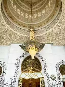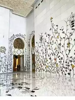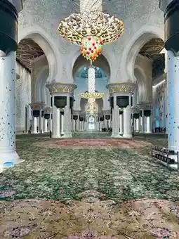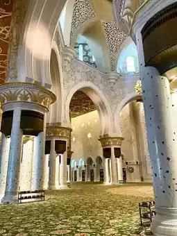 The mosque’s architectural design blends traditional Moorish, Mughal, and Persian styles with modern craftsmanship. With 82 domes, over 1,000 columns, and the world's largest hand-knotted carpet, every corner of the mosque showcases incredible attention to detail. Its gleaming white marble façade is adorned with intricate floral patterns and semi-precious stones, creating a serene yet regal ambiance.