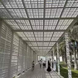 Walking beneath this canopy, you’re immersed in a serene play of light and shadow that changes throughout the day, making every visit a unique sensory experience. It beautifully connects modern architectural brilliance with the natural environment and local heritage, symbolizing the harmony between tradition and innovation.