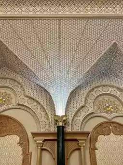 Looking up at the ceiling, you see endless arabesque patterns that seem to stretch infinitely. The floor is adorned with meticulously carved marble textures, and every pillar and doorframe is designed with perfect symmetry and balance.