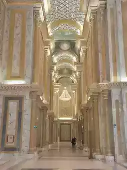 Qasr Al Watan, used as the Presidential Palace of Abu Dhabi, is more than just an administrative space—it’s a masterpiece and a cultural symbol in itself. Seen from afar, the palace is built with dazzling white marble that glimmers under the sunlight, adorned with golden accents that exude a majestic and grand aura.