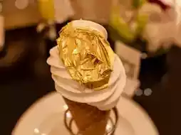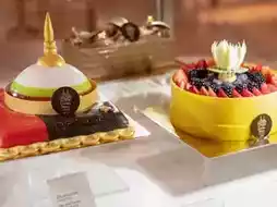 The desserts and drinks on the tables, each adorned with dazzling gold leaf, are a sight to behold.