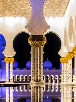 As sunlight slowly descends, cutting through the sky, the white domes of Sheikh Zayed Mosque catch the first light, radiating a dazzling brilliance. The marble floors gently reflect this light, creating a mirror-like connection between the heavens and the earth.