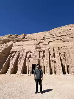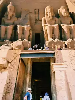 Experience the magic of ancient Egypt at Abu Simbel—a temple carved into the sandstone cliffs of Lake Nasser that's unimaginably grand! Four colossal statues of Pharaoh Ramesses II greet travelers with a tranquil gaze and warm morning sunlight. Don't forget to bring a camera or drone—the evening view is an unforgettable sight. And if you're lucky, you might even spot camels standing guard in front of the temple. 🐪✨
