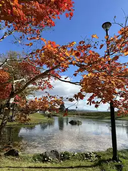 During fall foliage season, you can enjoy a vibrant display of fall foliage. 🍁 The view of Mount Yotei from afar is truly breathtaking. The snowy landscape of Mount Yotei against the sun-drenched blue sky is truly breathtaking!