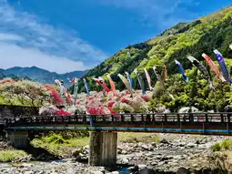 To take a photo of the whole of Hanamomo no Sato, you have to go from the top of the cliff on the other side. Before crossing the bridge with the carp streamers, take the road in front of Cafe Yamanaka on the opposite side of the road and walk for about 10 minutes up a steep hill (during this period, cars are not allowed to enter). This is also recommended if you have the stamina.