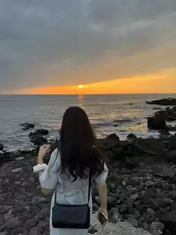 One of the must-see spots on any Jeju Island trip is the Aewol Beach.💙 The waves are calm, and the well-maintained coastal path is perfect for a stroll and taking in the panoramic views.🚶🏻♀️🌿 Especially at sunset, the sky and sea turn orange, creating a photogenic moment.📸✨ If you want to capture the perfect shot, I highly recommend visiting at sunset!