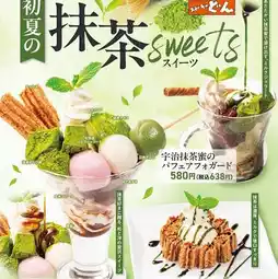 The lineup includes a parfait topped with three-colored dango, churros, and warabimochi, as well as matcha parfait affogato and bite-sized matcha warabimochi ♡