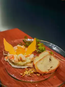The smooth avocado and chewy shrimp can be eaten with French bread.