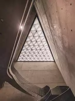 features a spiral staircase and a triangular ceiling that lets in natural light, and the combination with the concrete architecture