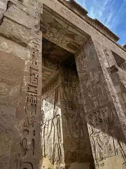 • Artistry: Vibrant reliefs—depicting battles (like the famed Sea Peoples), religious rituals, and royal processions—remain wonderfully preserved. You’ll spot statues of Ramses III, detailed inscriptions, and richly colored carvings.