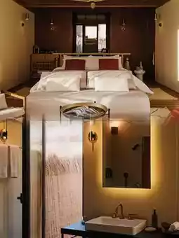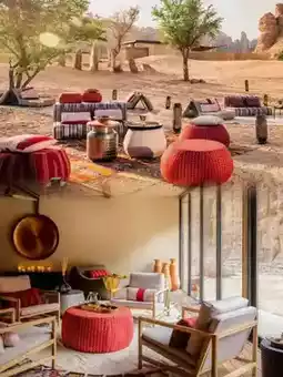 The hotel is located in AlUla, Saudi Arabia, hidden deep in the desert, surrounded by spectacular sandstone cliffs. Secluded and serene, it exudes an air of mystery. Here, time seems to slow down, allowing you to appreciate the grandeur of nature and your own insignificance, bringing an unprecedented sense of inner peace.