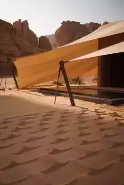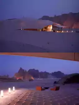 The rooms are simple yet full of details, and each floor-to-ceiling window frames a flowing desert painting: the morning light plates the sand grains with gold leaf, and the twilight dyes the rock walls into red copper. The night wind blows through the folds of the tent, like the murmur of nomads.