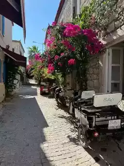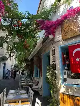 Start your day with a Turkish breakfast at a cozy café in Alaçatı's charming stone streets 🍳☕. Wander the bougainvillea-draped alleys, snapping pics of historic houses and vibrant markets 🏘️📸.