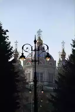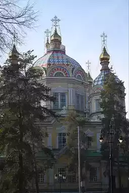 Almaty's Zenkov Cathedral, a wooden structure built without a single nail, is a marvel. Its golden domes gleam in the sunlight, and the pastel blue, yellow, and pink of its exterior evoke a fairytale castle. Inside, soft light streams through stained-glass windows, illuminating ancient murals. The air is filled with the scent of candles and incense, creating a serene and sacred atmosphere.