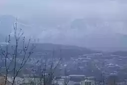 In the evening, from a panoramic viewpoint, the distant city bathed in the golden glow of the setting sun. Almaty's buildings, though not towering, possess a gentle charm. Sunlight dances on windows, reflecting people returning home, and the city's pulse slows amidst the warm hues.