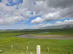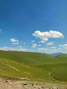 Birch forests stand like guards on both sides of the river valley, their trunks as white as snow, leaves rustling in the wind as if whispering ancient legends. Clear streams rush down from the snow-capped mountains, winding through the grasslands, the sound of water flowing, reflecting the blue sky and white clouds like shining silver chains. Nomads' yurts are scattered on the hillsides, with curling smoke blending with the white dots of sheep, forming a moving pastoral poem.