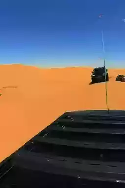 Our convoy speeds through the golden sand sea, with the roar of engines and flying sand, under the blue sky, the vast desert. The sand dunes undulate like waves, showing us the vastness of the desert in a gentle and flowing way.